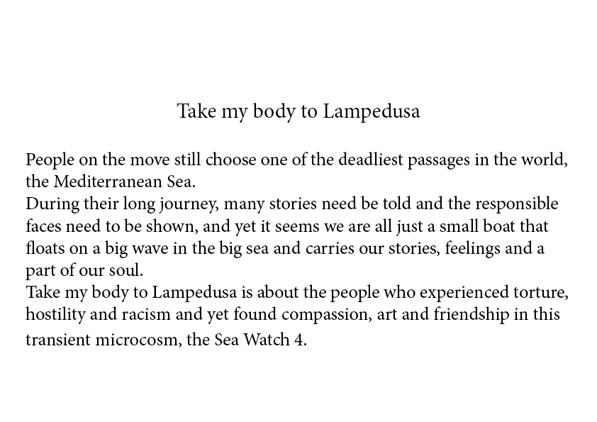 • A passenger after rescue that wants to remain anonymous. *** People on the move still choose one of the deadliest passages, the mediterranean sea. They experienced torture, hostility and racism and yet found compassion, art and friendship on this small microorganism the Sea Watch 4.